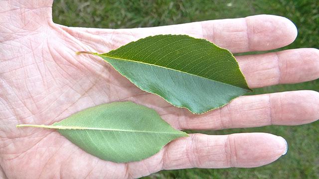 vogelkersbes, pit is giftig voor mensen                  blad vogelkers, giftig voor mensen